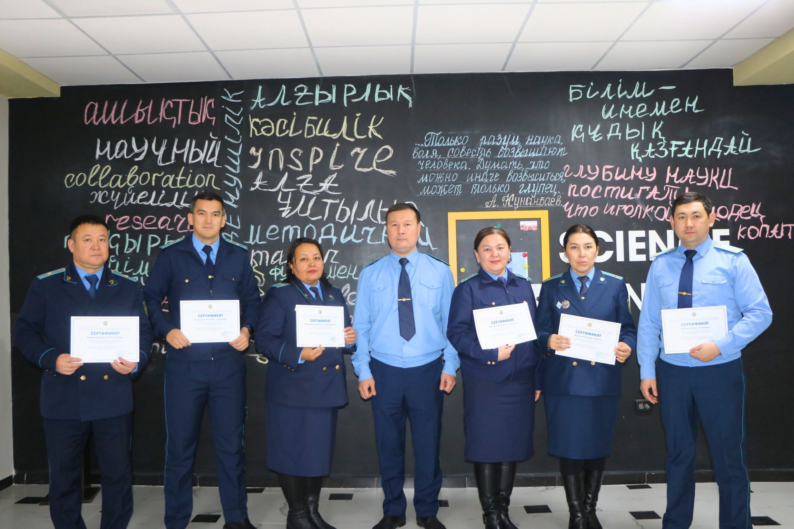 2025 жылғы 11 желтоқсанда Қазақстан Республикасы Бас прокуратурасының жанындағы Құқық қорғау органдары академиясының Ведомствоаралық ғылыми-зерттеу институтында Ғылыми даму мектебі аясында «Ғылыми зерттеулер жүргізу әдістемесі» курсын тәмамдаған 1‑Институт қызметкерлеріне сертификаттар табысталды.